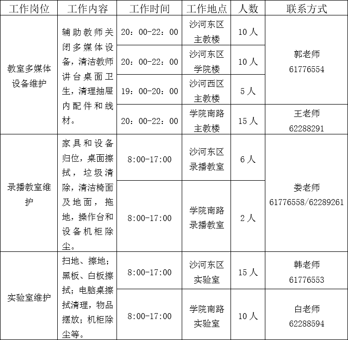 目前我校两校区共有多媒体教室161间,实验室13间,录播教室2间。为创造更好的教学环境,经与学校团委沟通协商,现面向全校学生招聘志愿者,进行两校区多媒体教室、实验室和录播教室的设备维护、环境清洁、线材整理等工作,并由校团委予以认定校内志愿服务小时数。具体如下: