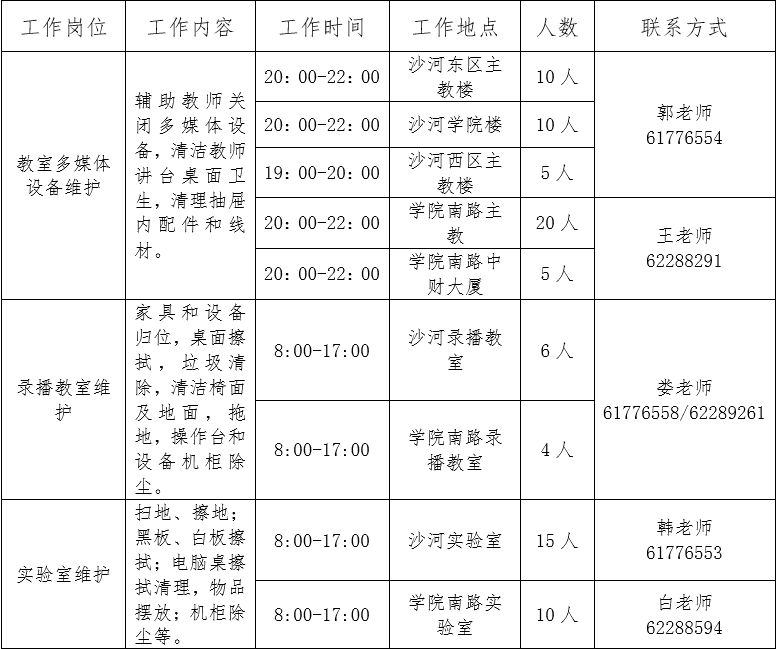 目前我校两校区共有多媒体教室184间,实验室13间,录播教室2间。为创造更好的教学环境,经与学校团委等沟通,现面向全校学生招聘志愿服务人员,进行两校区多媒体教室、实验室和录播教室的设备维护、环境清洁、线材整理等工作,并由校团委以校内志愿服务小时数的形式予以确认。具体如下: